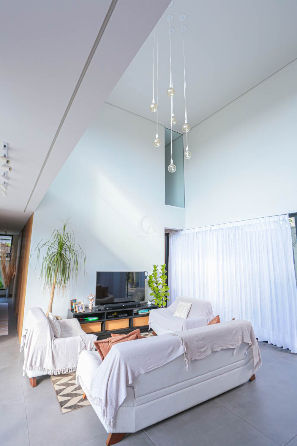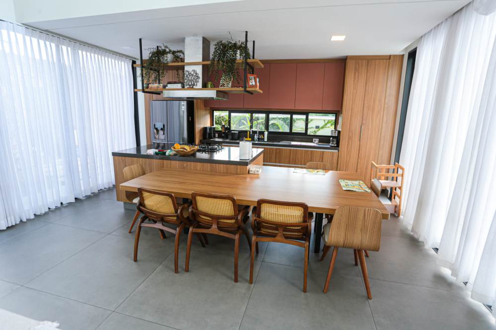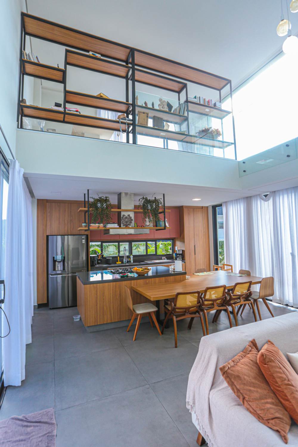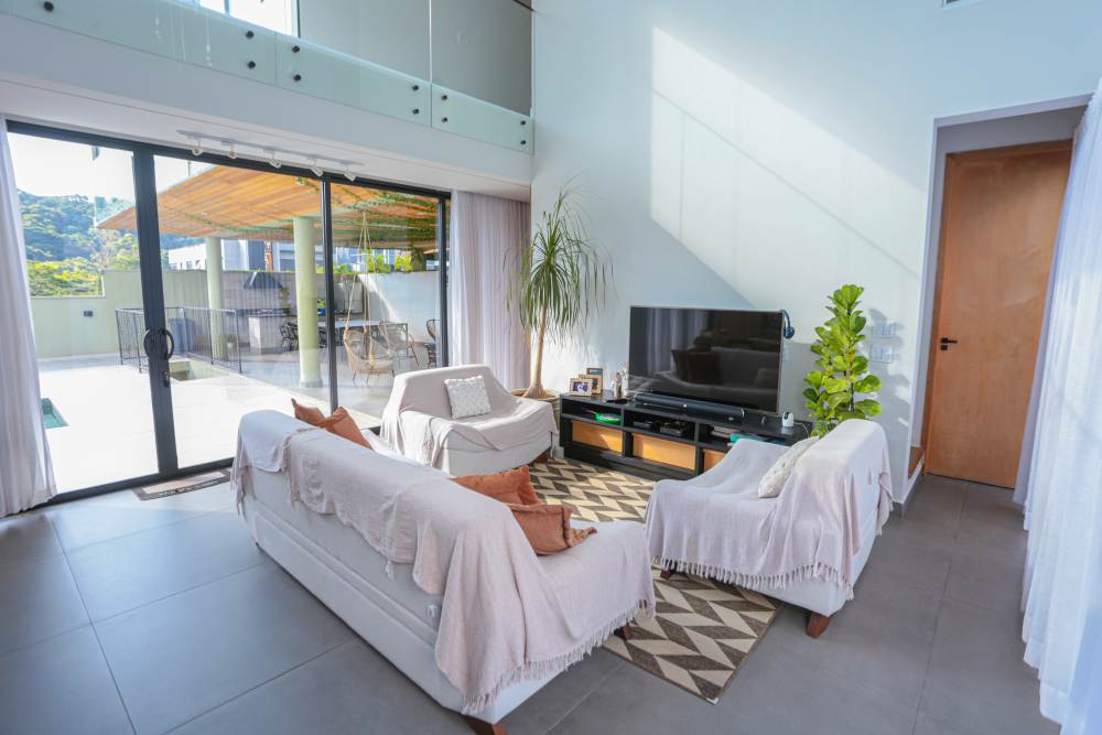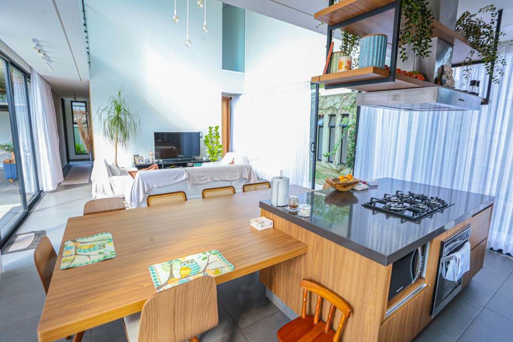 • Sala com pé direito duplo, integrada à área de lazer e cozinha americana