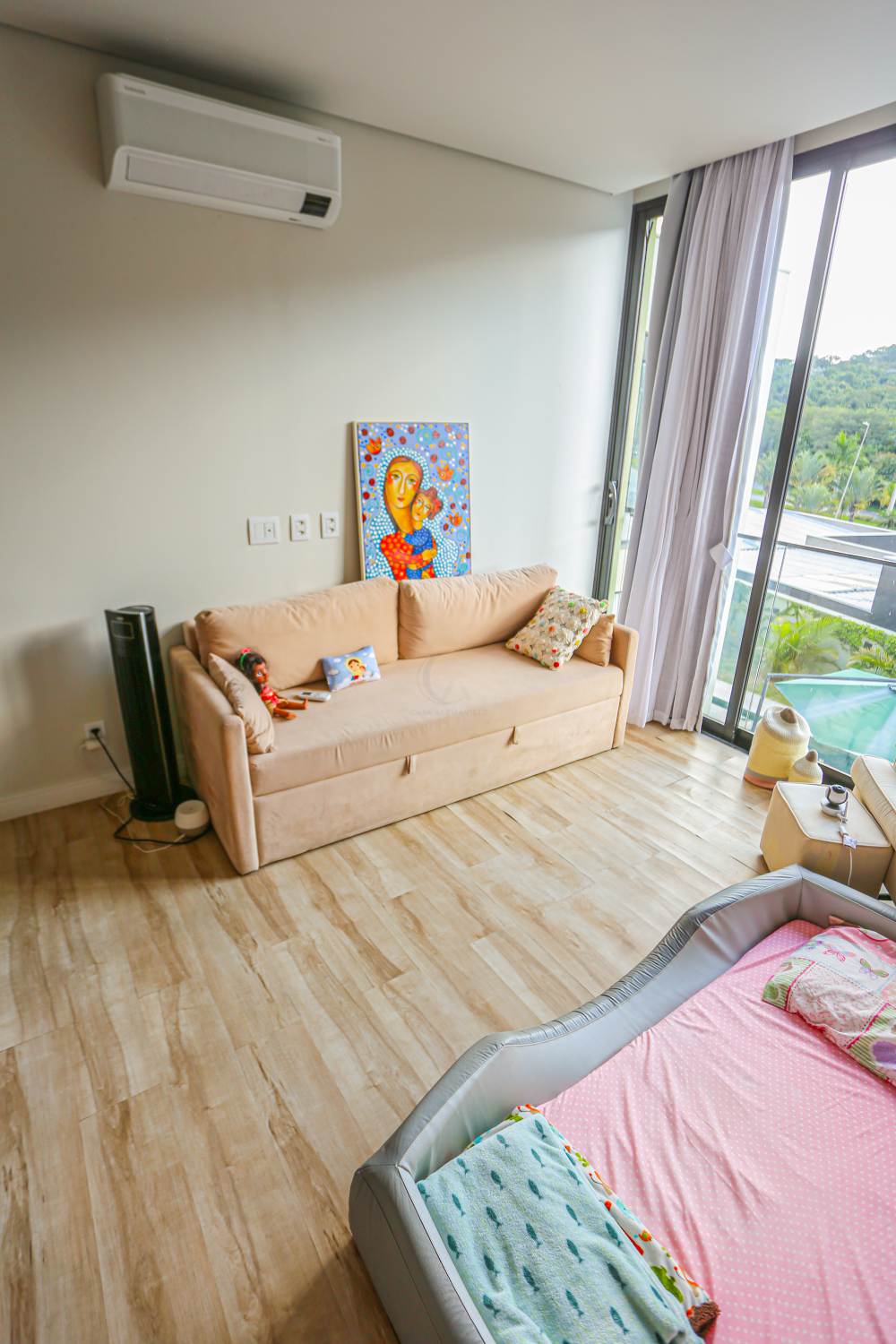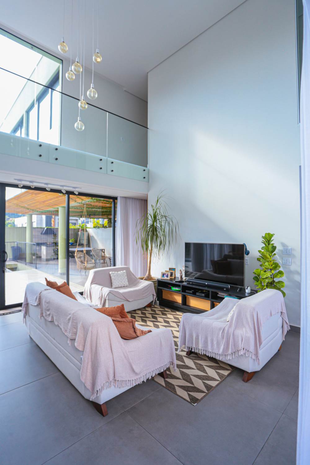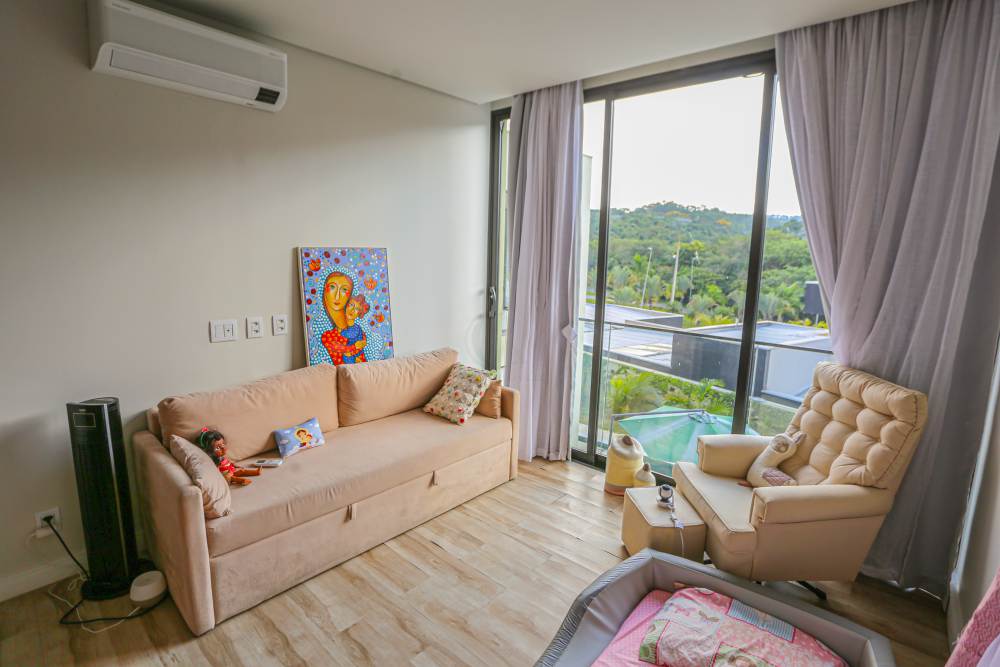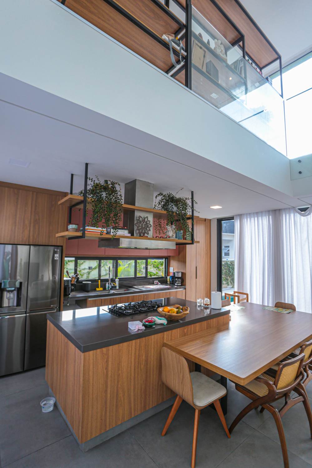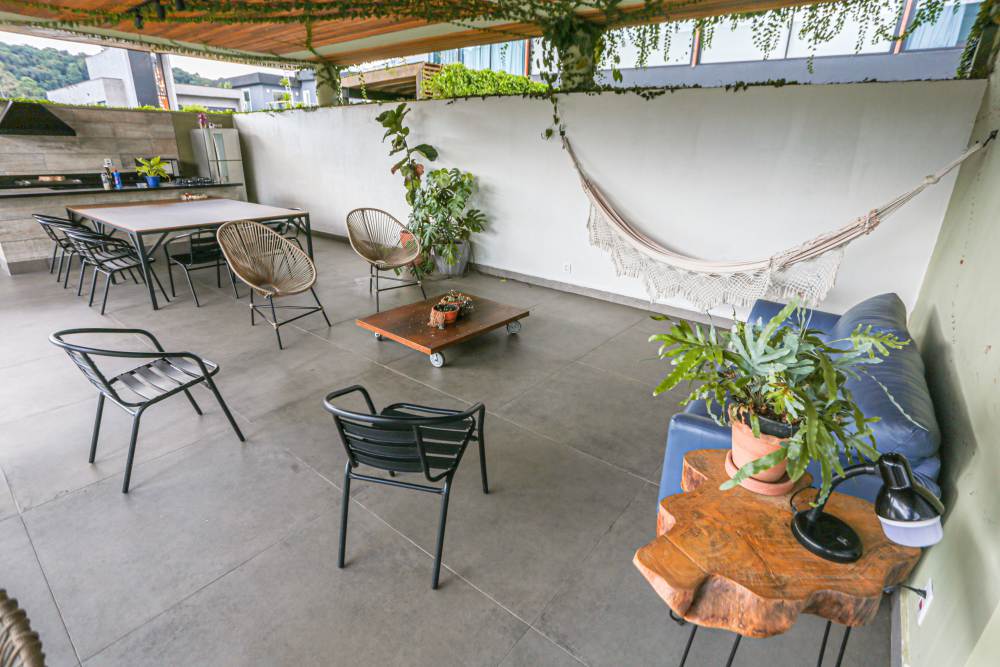 • Sala com pé direito duplo, integrada à área de lazer e cozinha americana