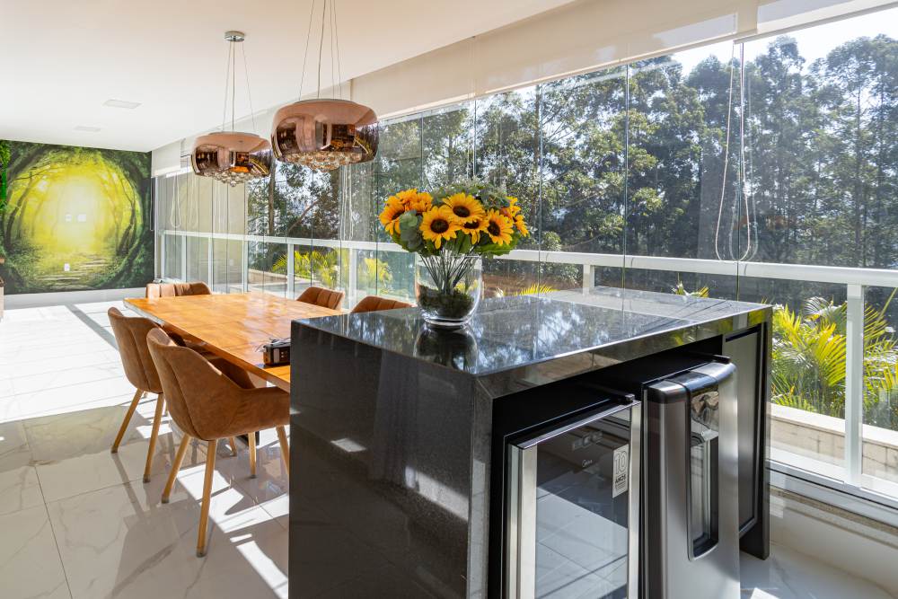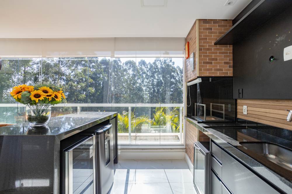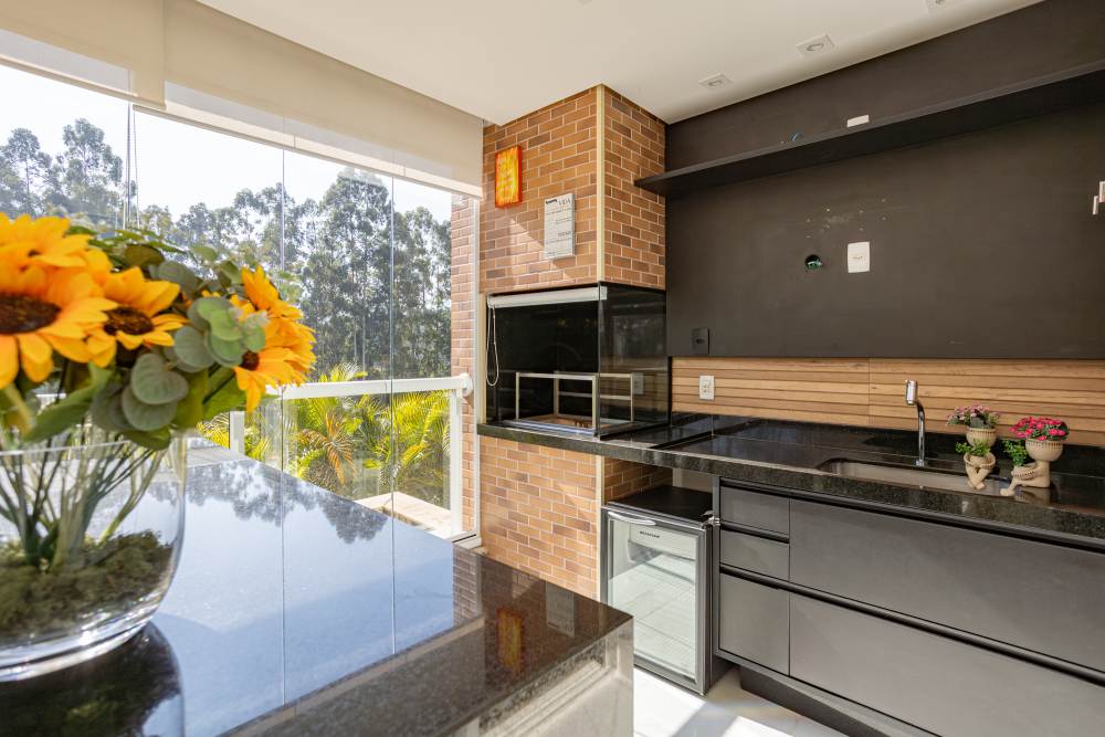 • Varanda gourmet generosa com churrasqueira a carvão, perfeita para momentos de lazer