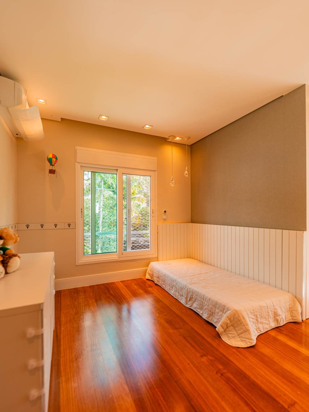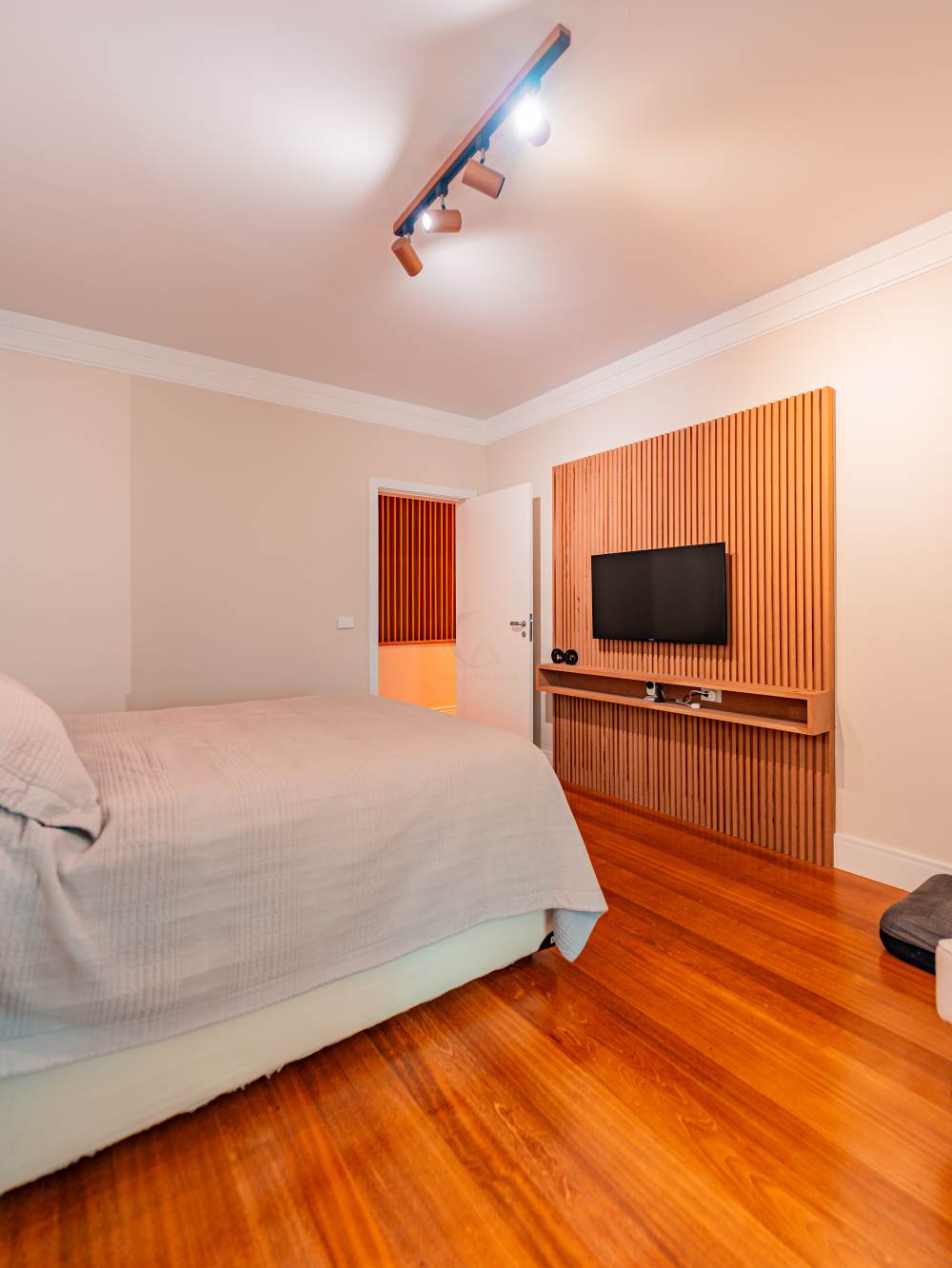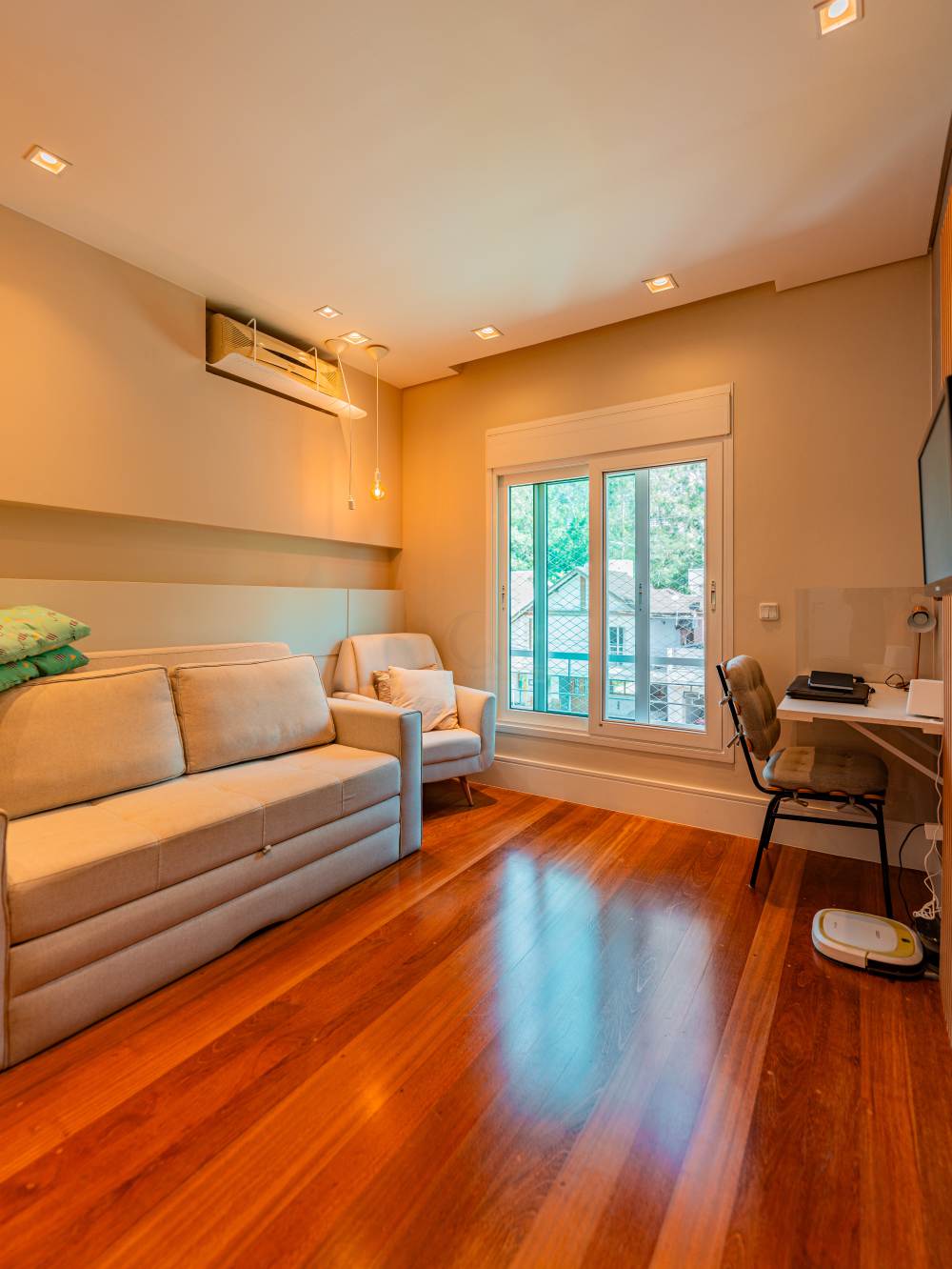 No pavimento superior, um belíssimo assoalho de madeira jatobá reveste os ambientes. Há três suítes amplas, todas com persianas automáticas. A suíte máster é um verdadeiro refúgio, com closet, pia dupla e chuveiro duplo em seu banheiro, além de um escritório privativo dentro da própria suíte. Todos os ambientes são climatizados com ar-condicionado, e a casa conta ainda com sistemas de energia solar e fotovoltaico, proporcionando eficiência energética e sustentabilidade.