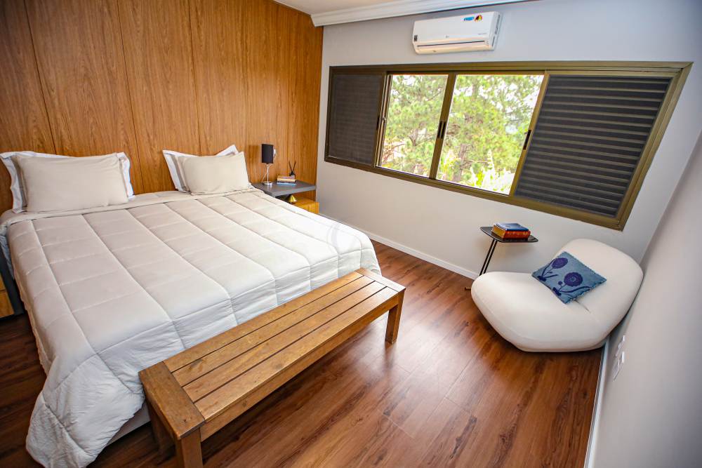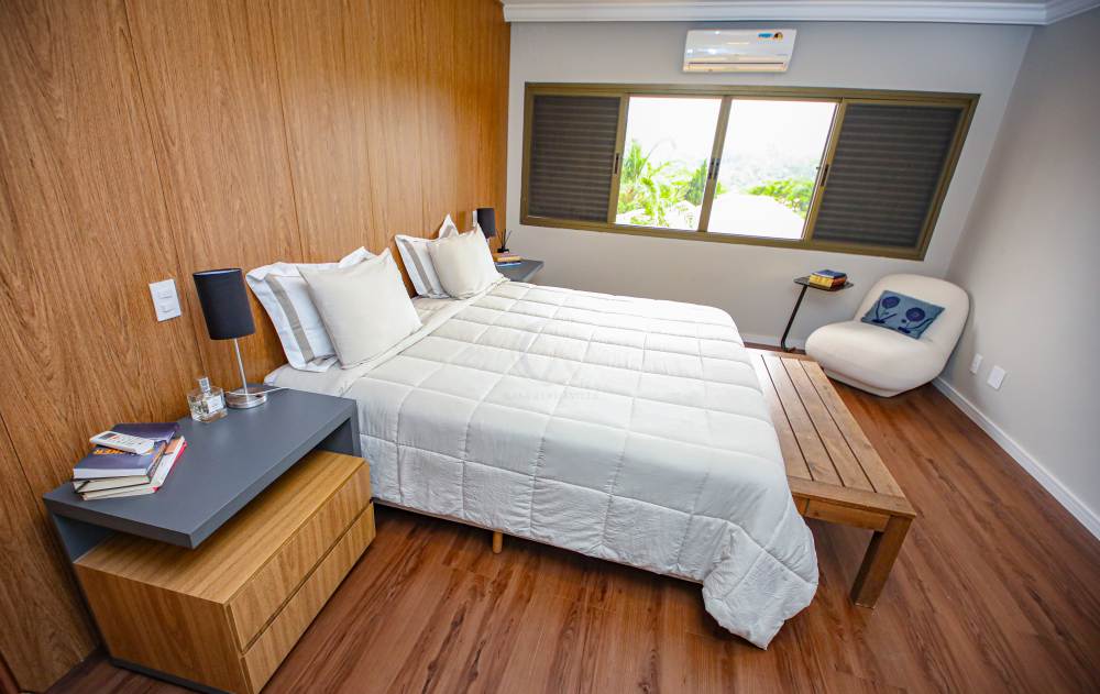 • 4 suítes amplas, todas com ar-condicionado, armários planejados e vista para a