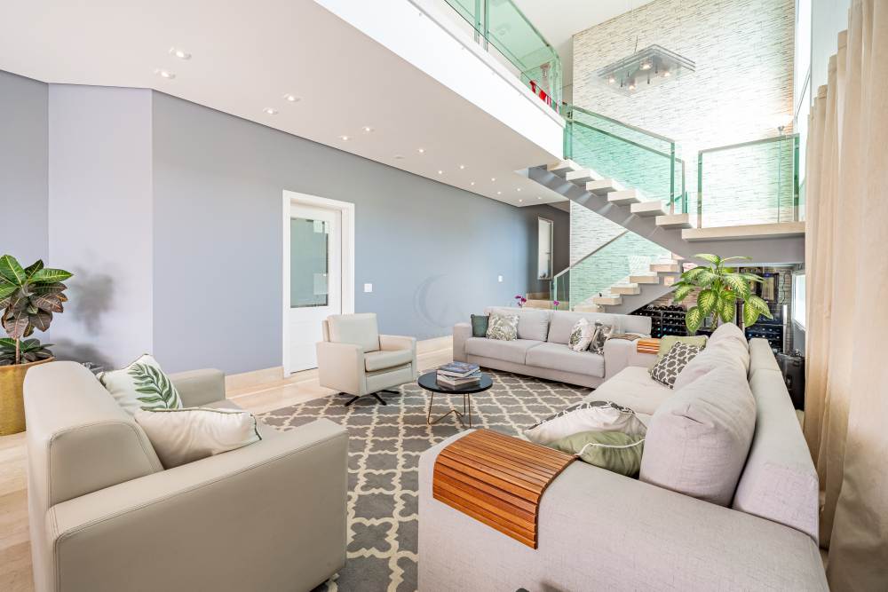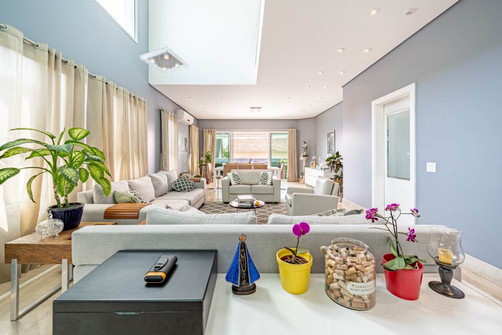 Living amplo e integrado, com pé-direito alto e perfeita iluminação natural,
