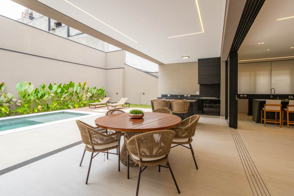 • Piscina iluminada e churrasqueira em espaço de lazer aconchegante
