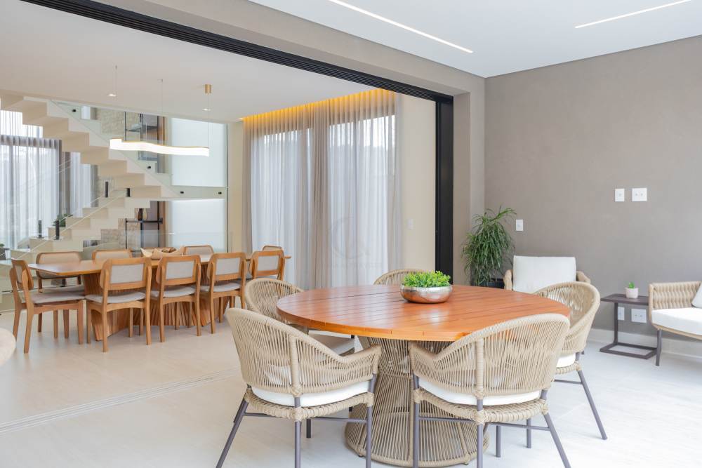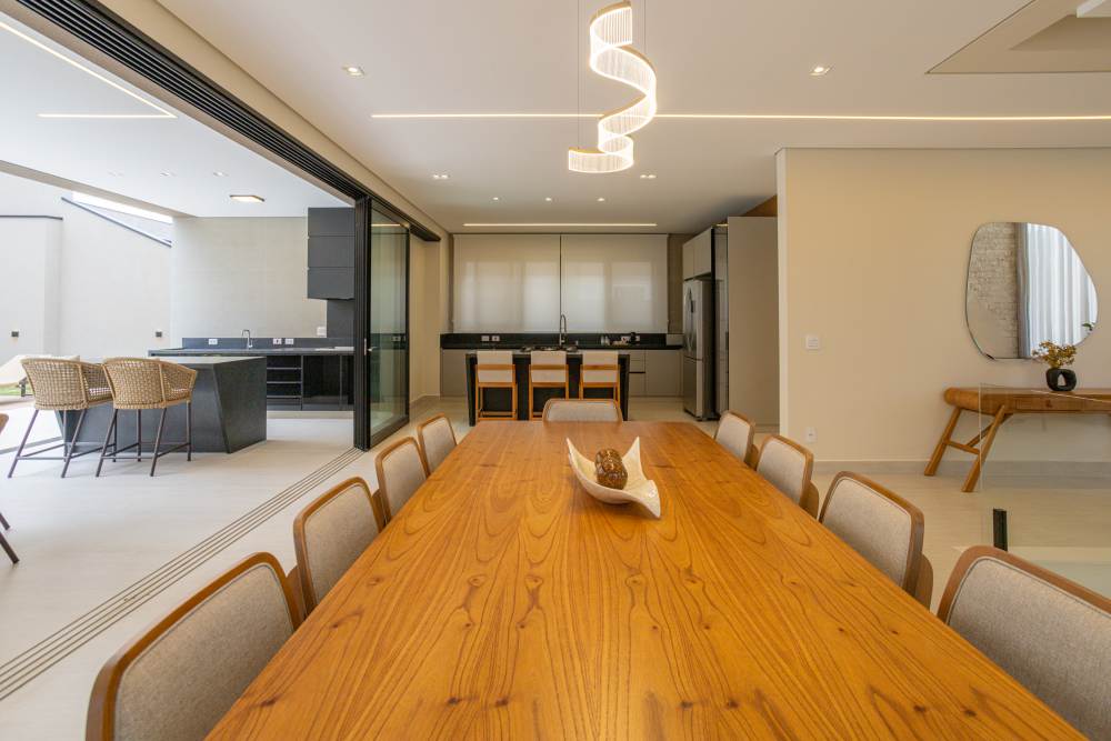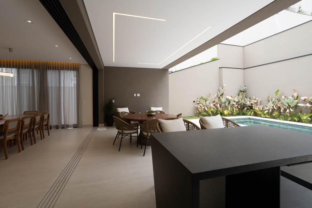 Ambientes integrados que unem living, escritório e área gourmet com fluidez