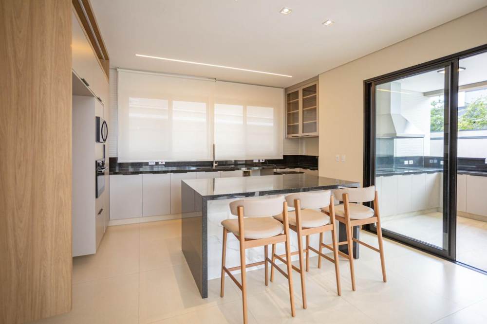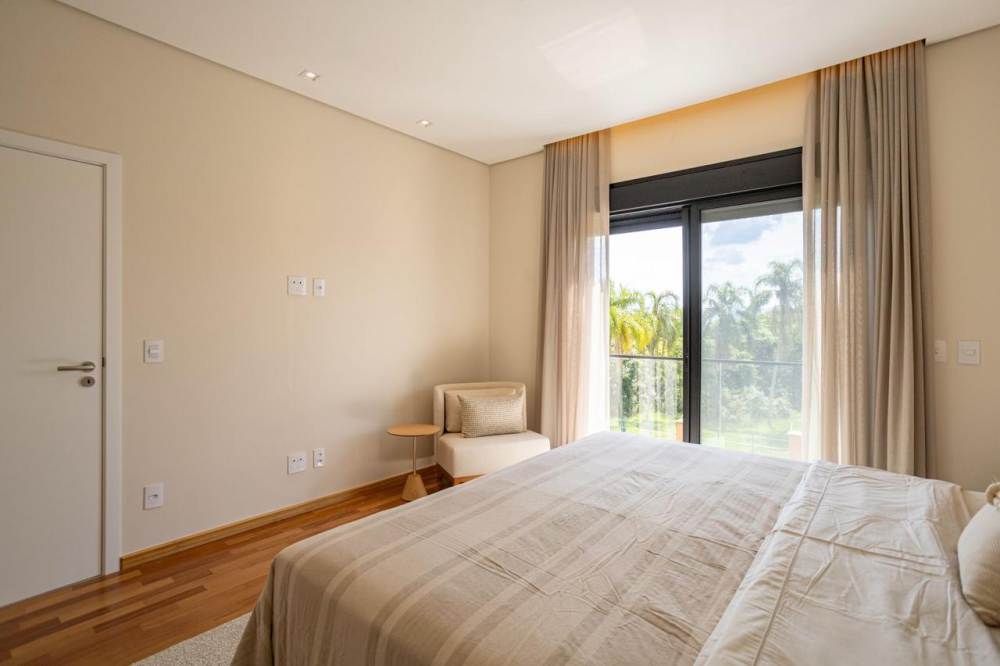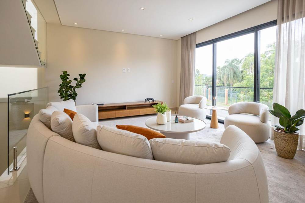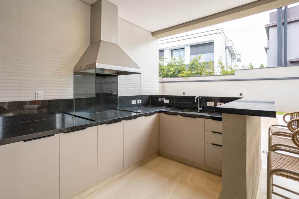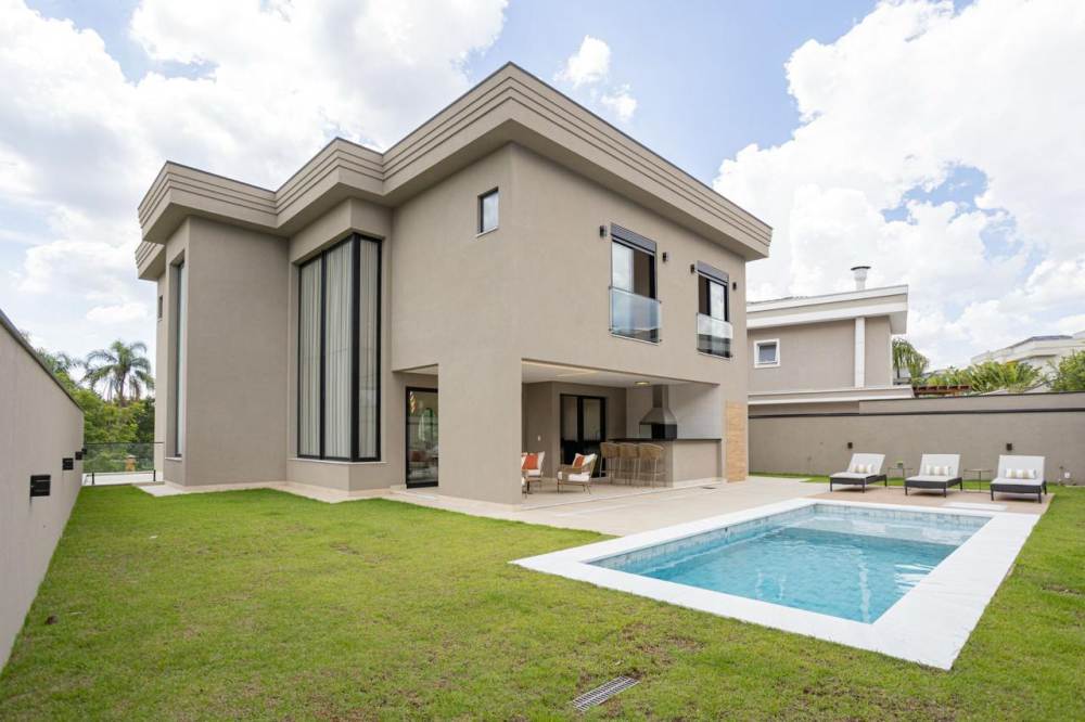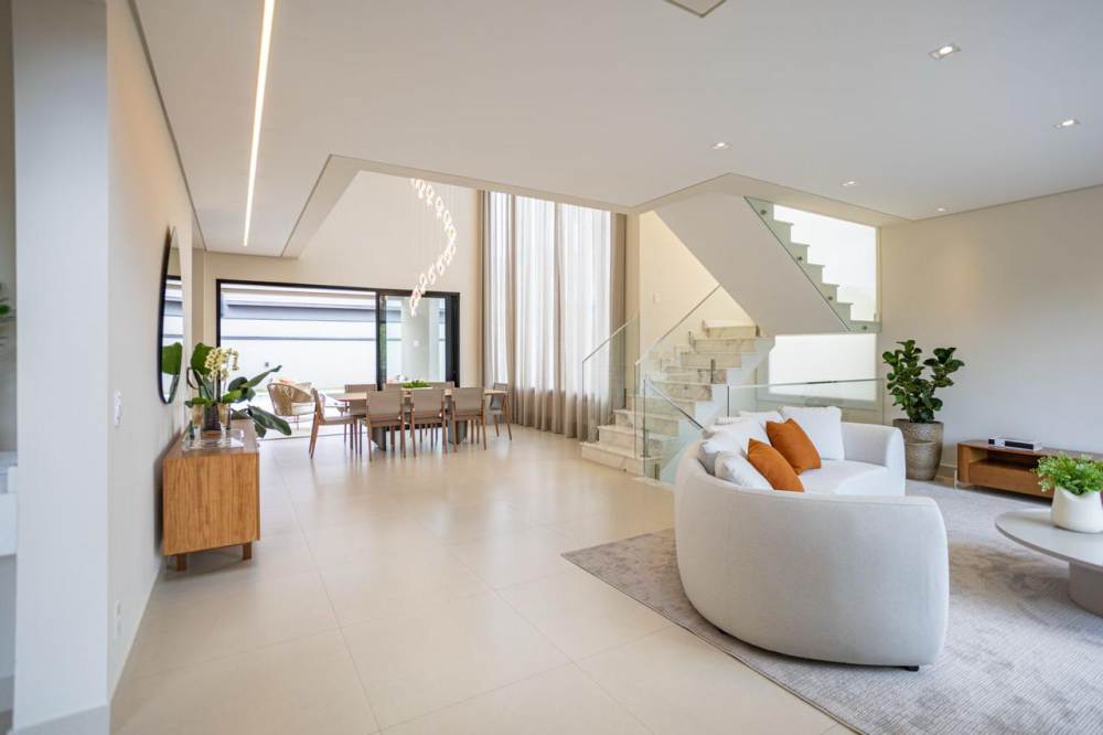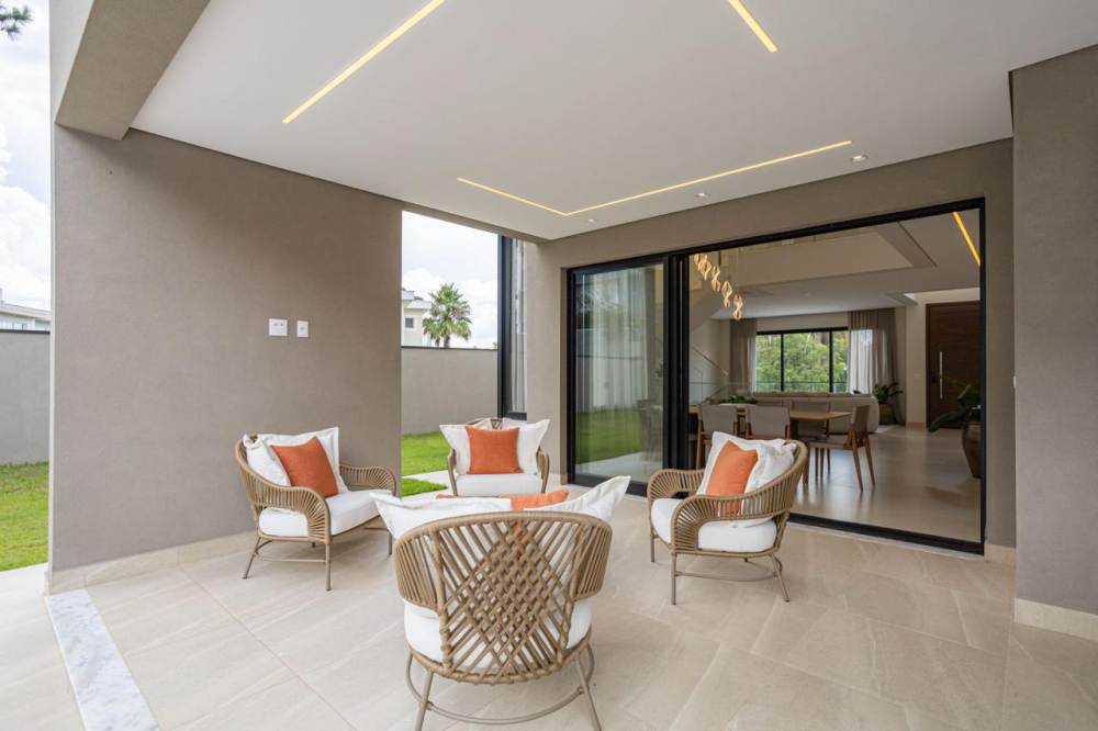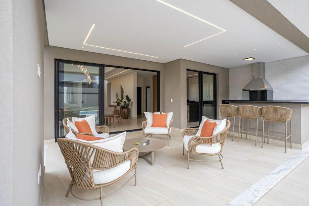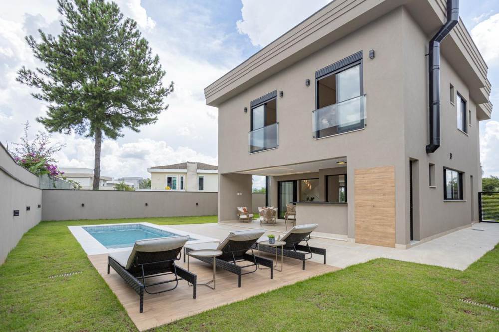 Sala com pé direito duplo, escritório, cozinha com ilha, área gourmet e piscina. Ampla área de lazer com quintal diferenciado comparada com outros imóveis do condomínio.