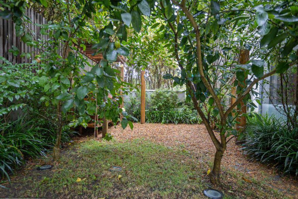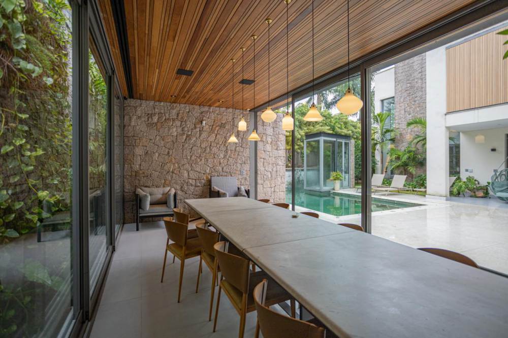 ● Área gourmet com teto em madeira Neobambu, espelhos d’água, sauna e piscina