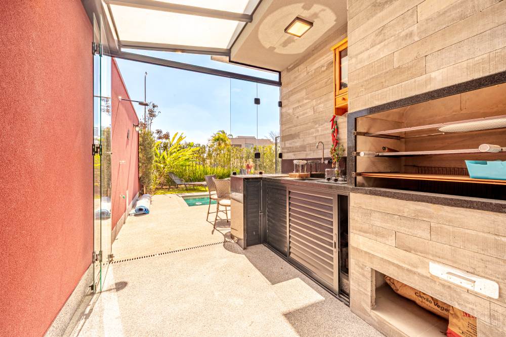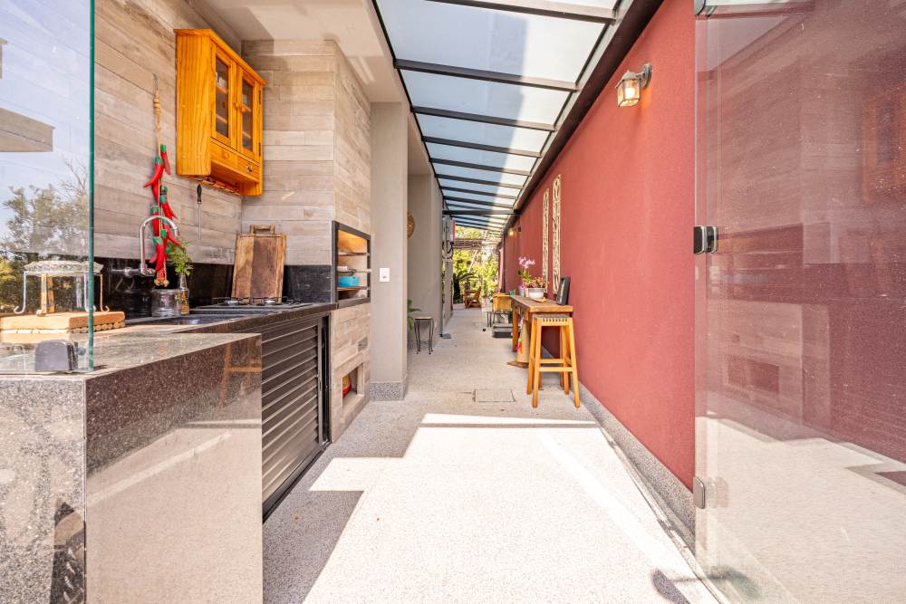 Espaço gourmet com churrasqueira à carvão e cooktop a gás