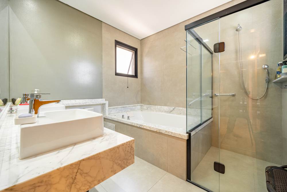 Suíte master com closet ele/ela, banheira e varanda
