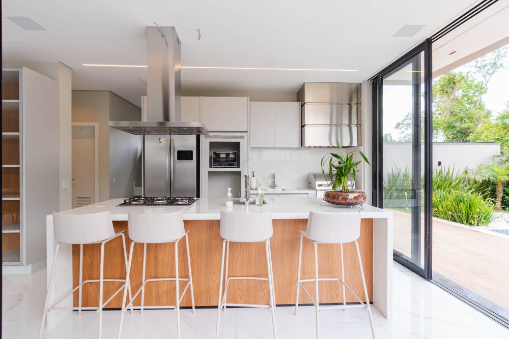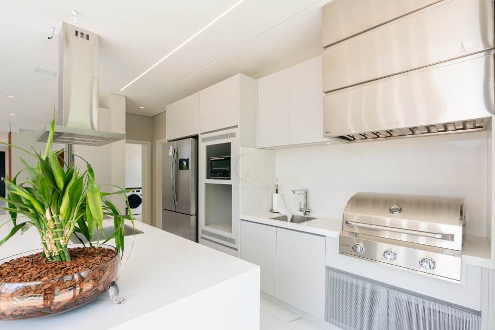 • Cozinha ampla com bancada em quartzo, ilha com cuba inox, equipada com