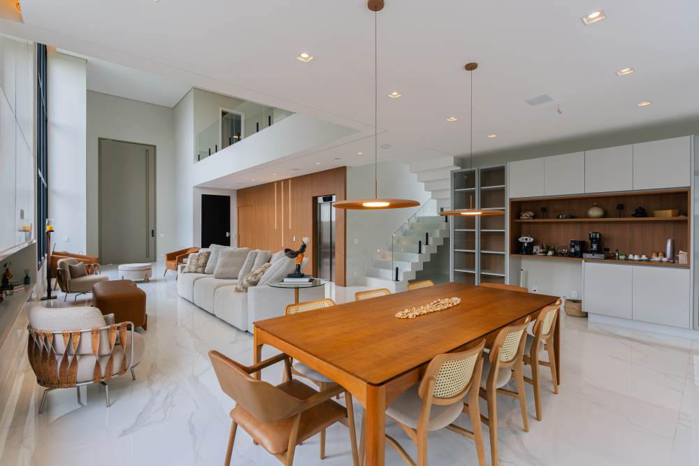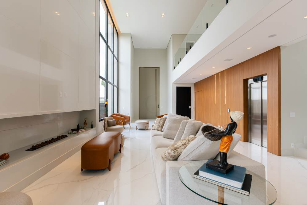 • Planta integrada, com living de entrada imponente, pé-direito duplo, sala com lareira a