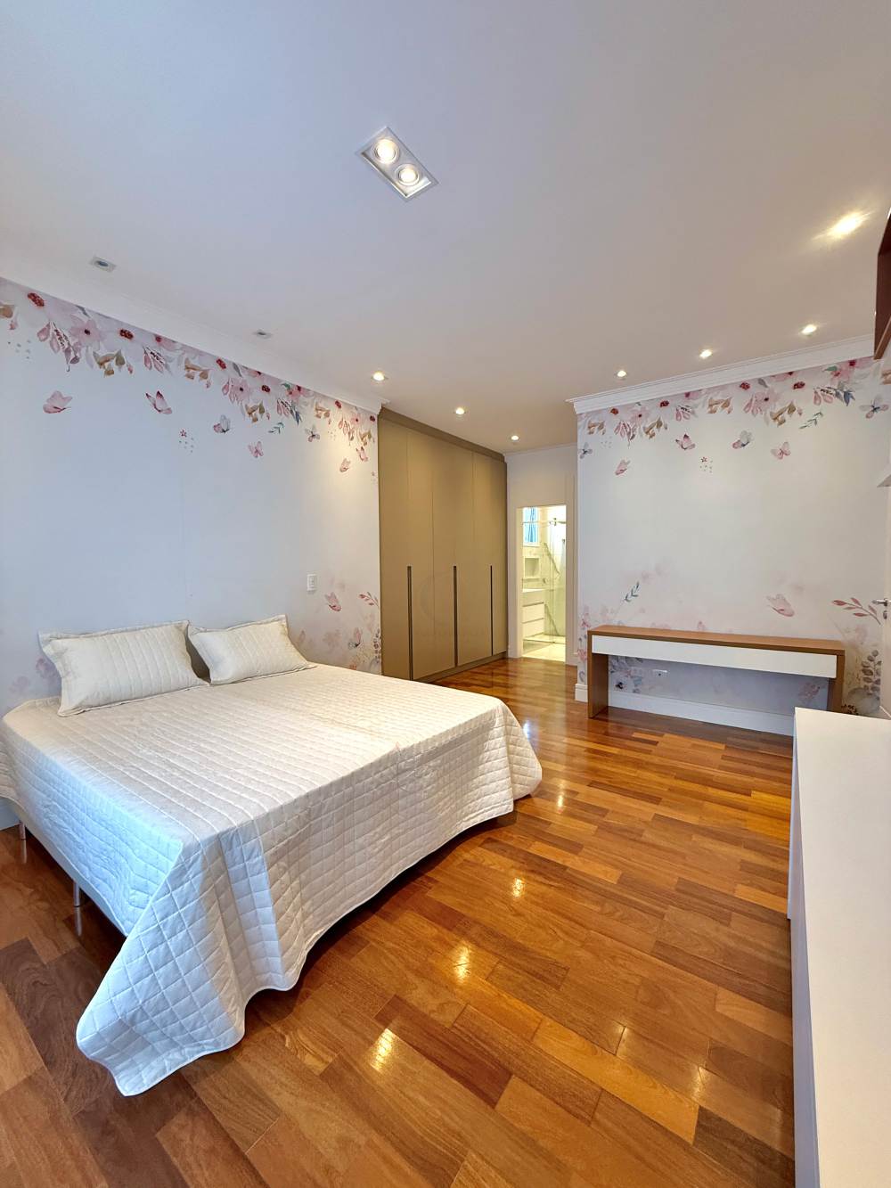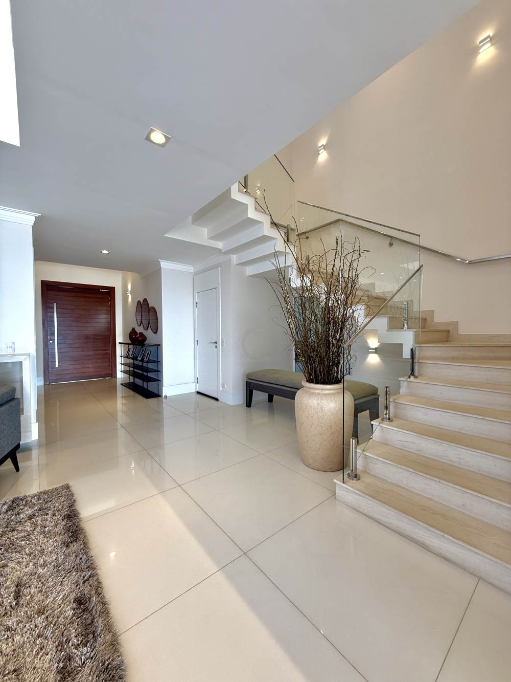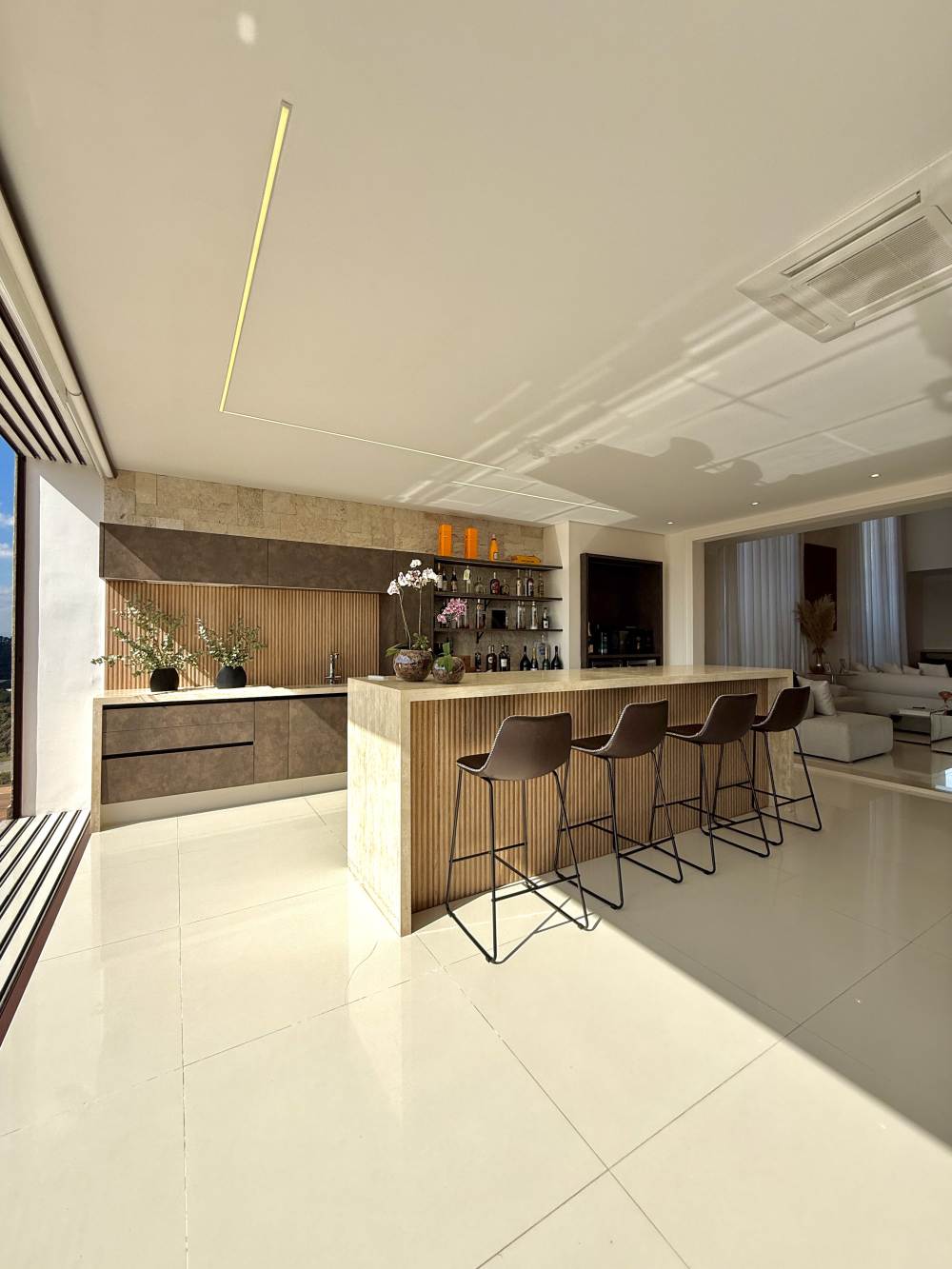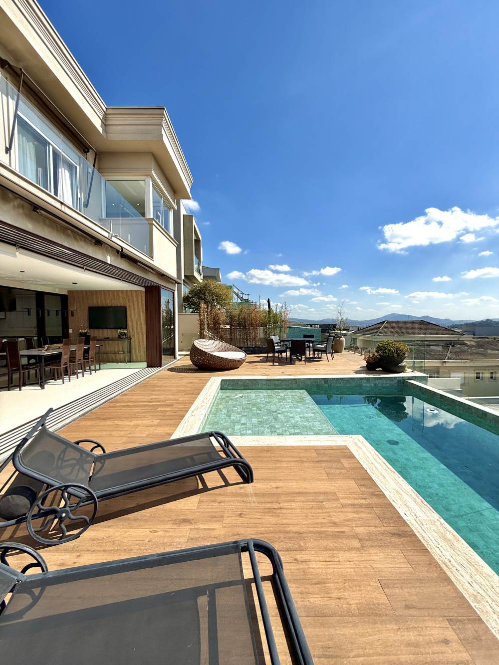 O pé direito duplo é imponente e dá um charme diferenciado ao imóvel. São 4 suítes, muito bem distribuídas em uma área construída de 430 m². A casa já está totalmente mobiliada e decorada, prontíssima para morar! Os móveis fixos são, em sua maioria, da ID Móveis, com exceção do espaço gourmet, que é assinado pela Kitchens. A infraestrutura é completa, com toda comodidade que a sua família busca!