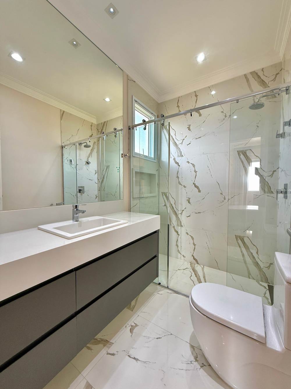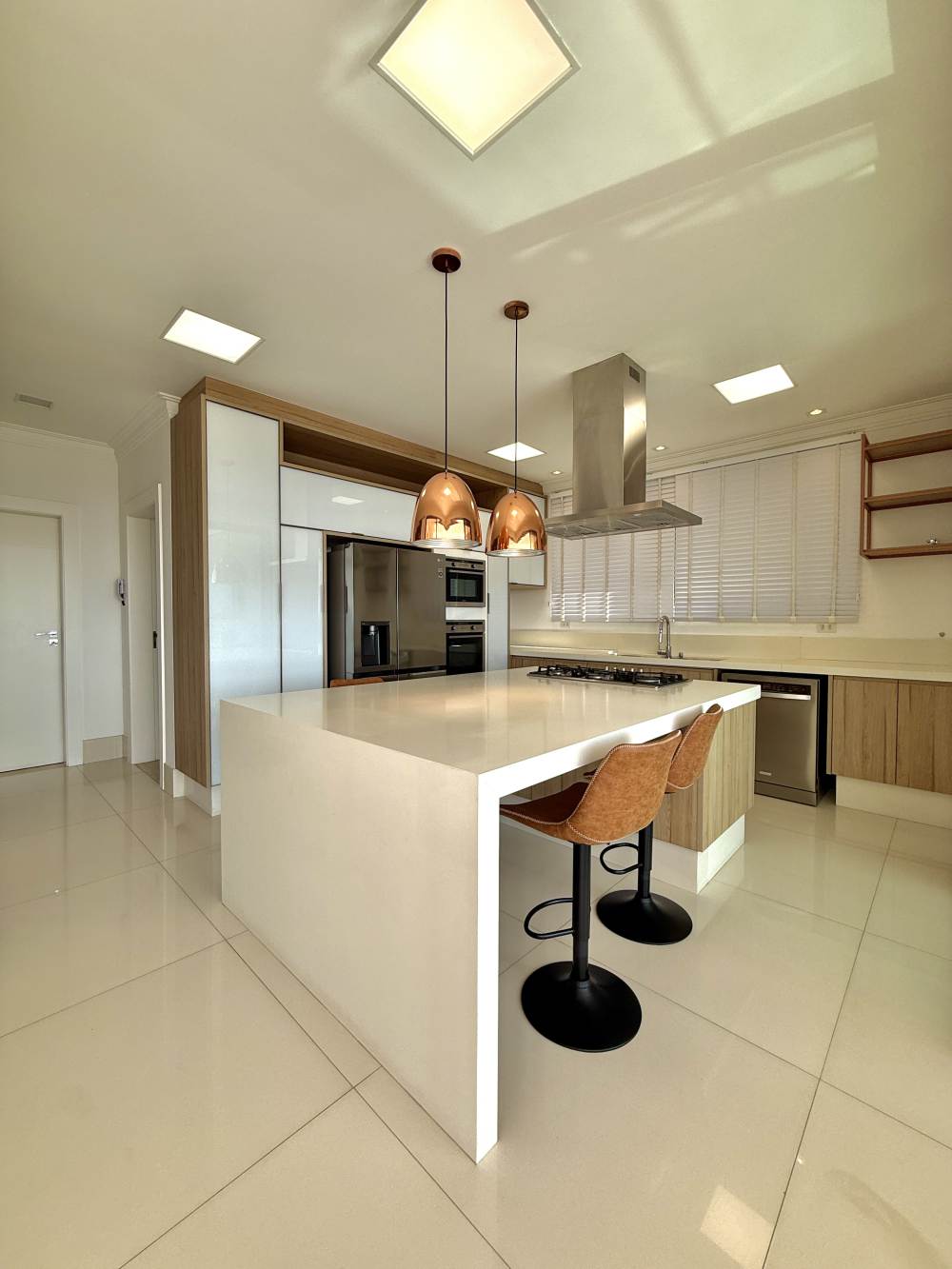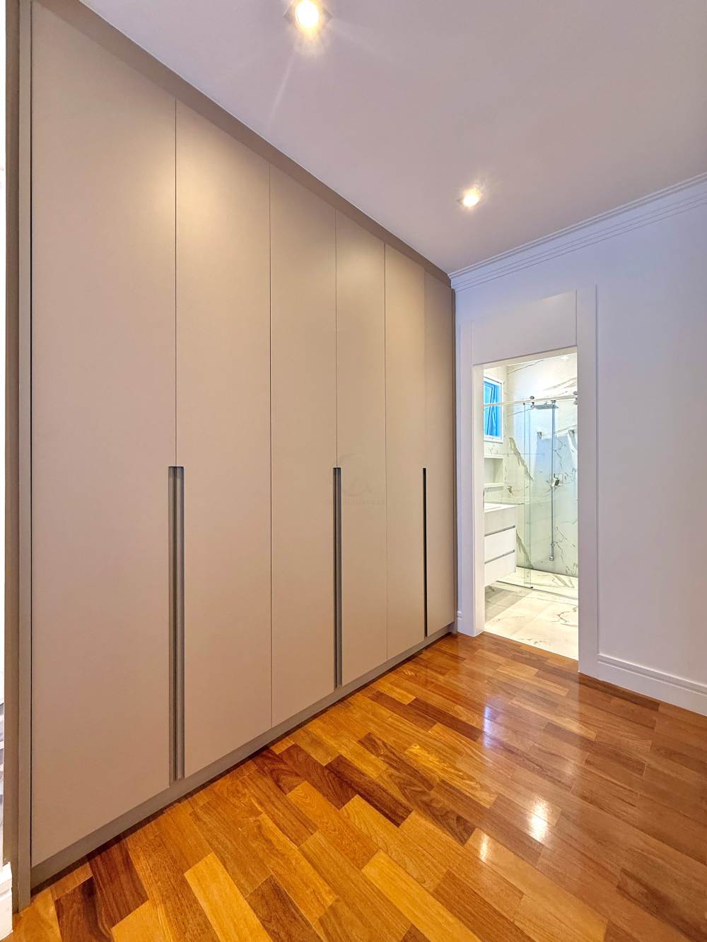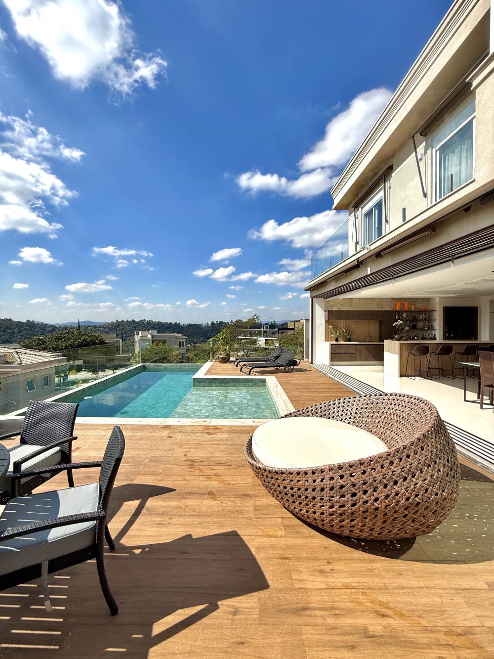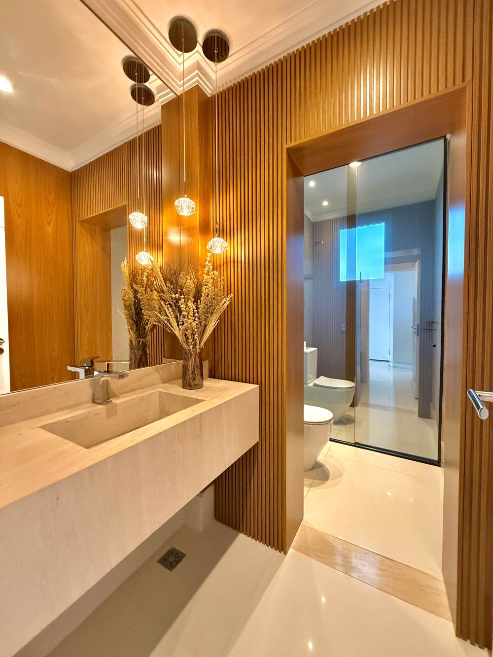 O pé direito duplo é imponente e dá um charme diferenciado ao imóvel. São 4 suítes, muito bem distribuídas em uma área construída de 430 m². A casa já está totalmente mobiliada e decorada, prontíssima para morar! Os móveis fixos são, em sua maioria, da ID Móveis, com exceção do espaço gourmet, que é assinado pela Kitchens. A infraestrutura é completa, com toda comodidade que a sua família busca!