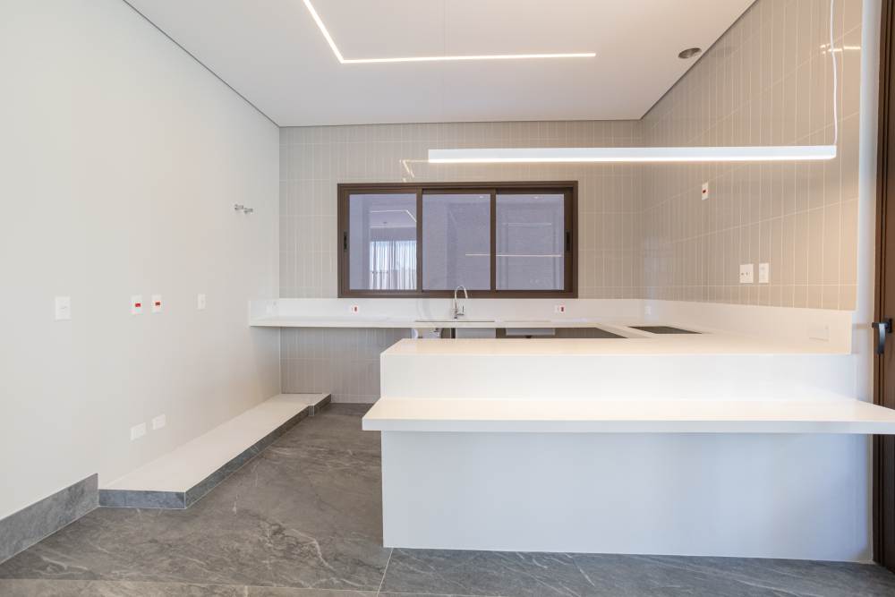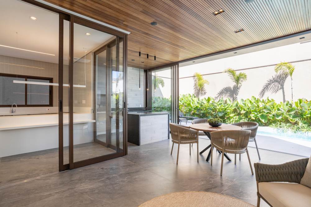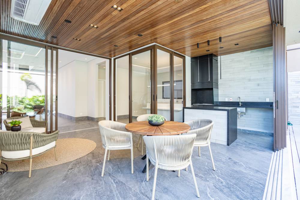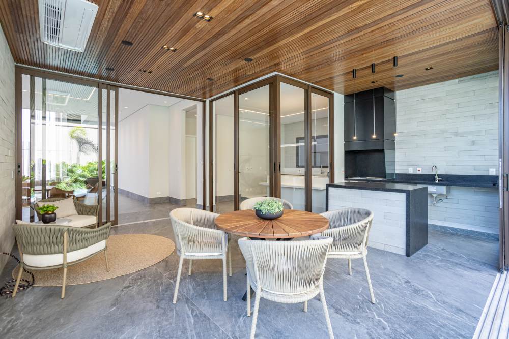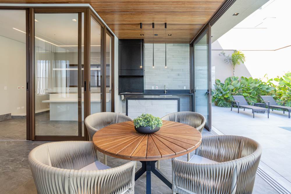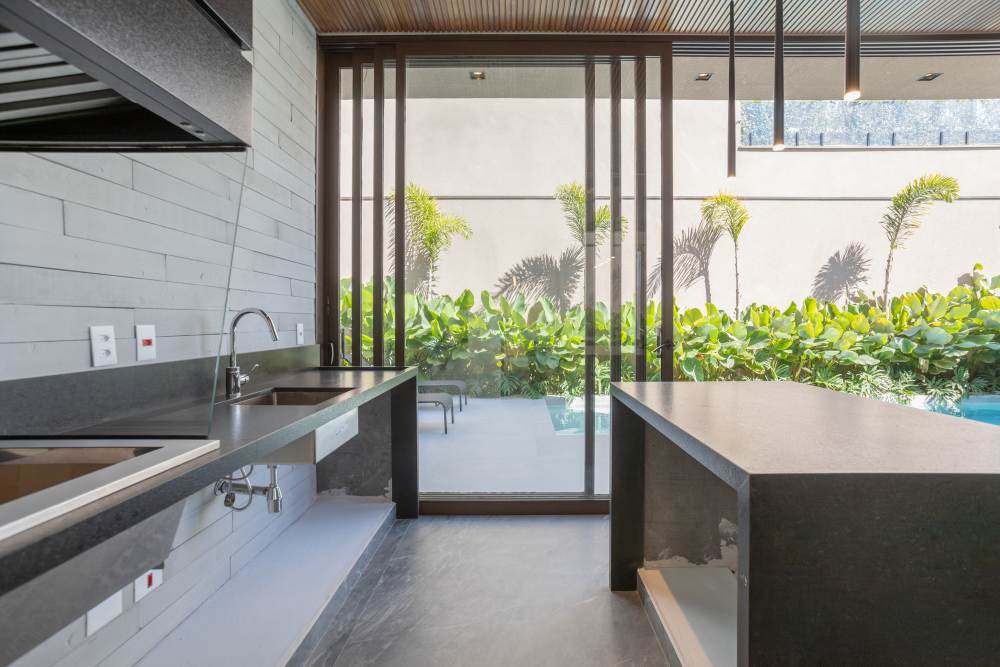 ● Cozinha e área gourmet integradas com churrasqueira ArtGrill, forno e marcenaria