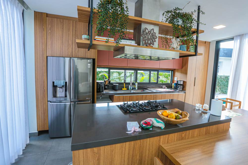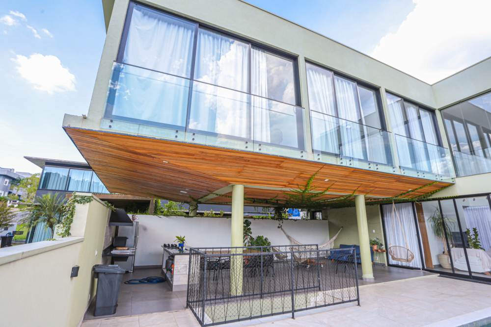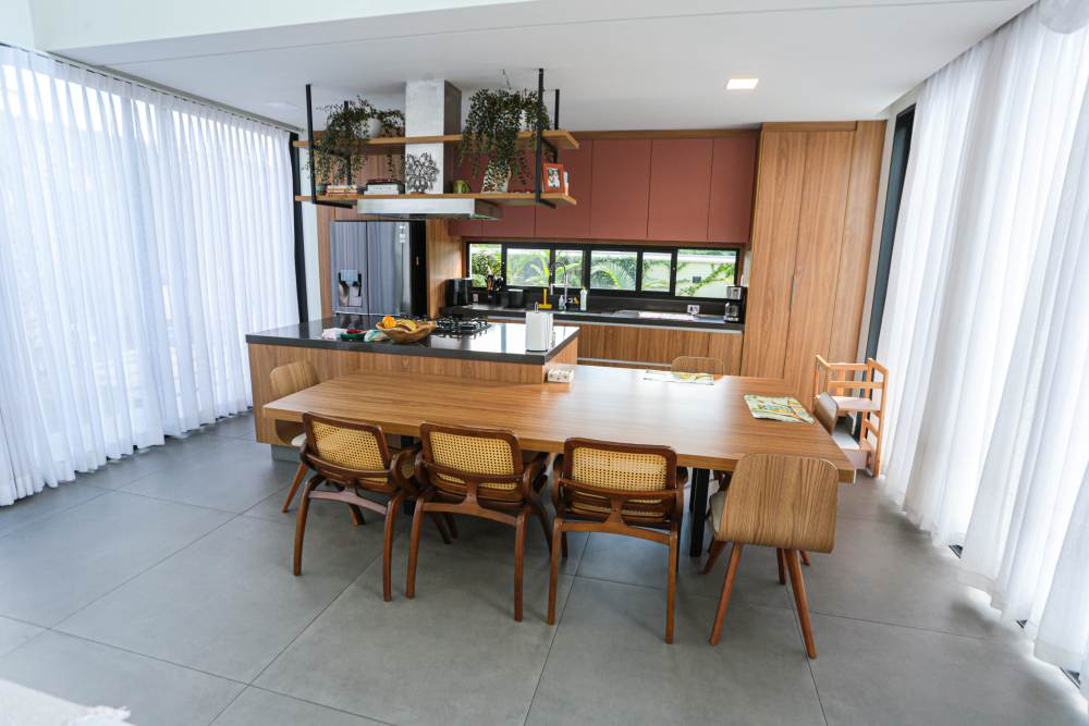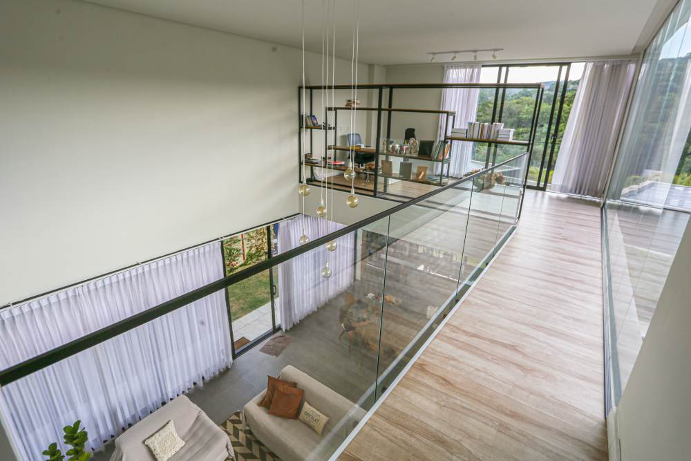 Escritório no primeiro pavimento, sala com pé direito duplo integrada com a área de lazer e cozinha estilo americana.