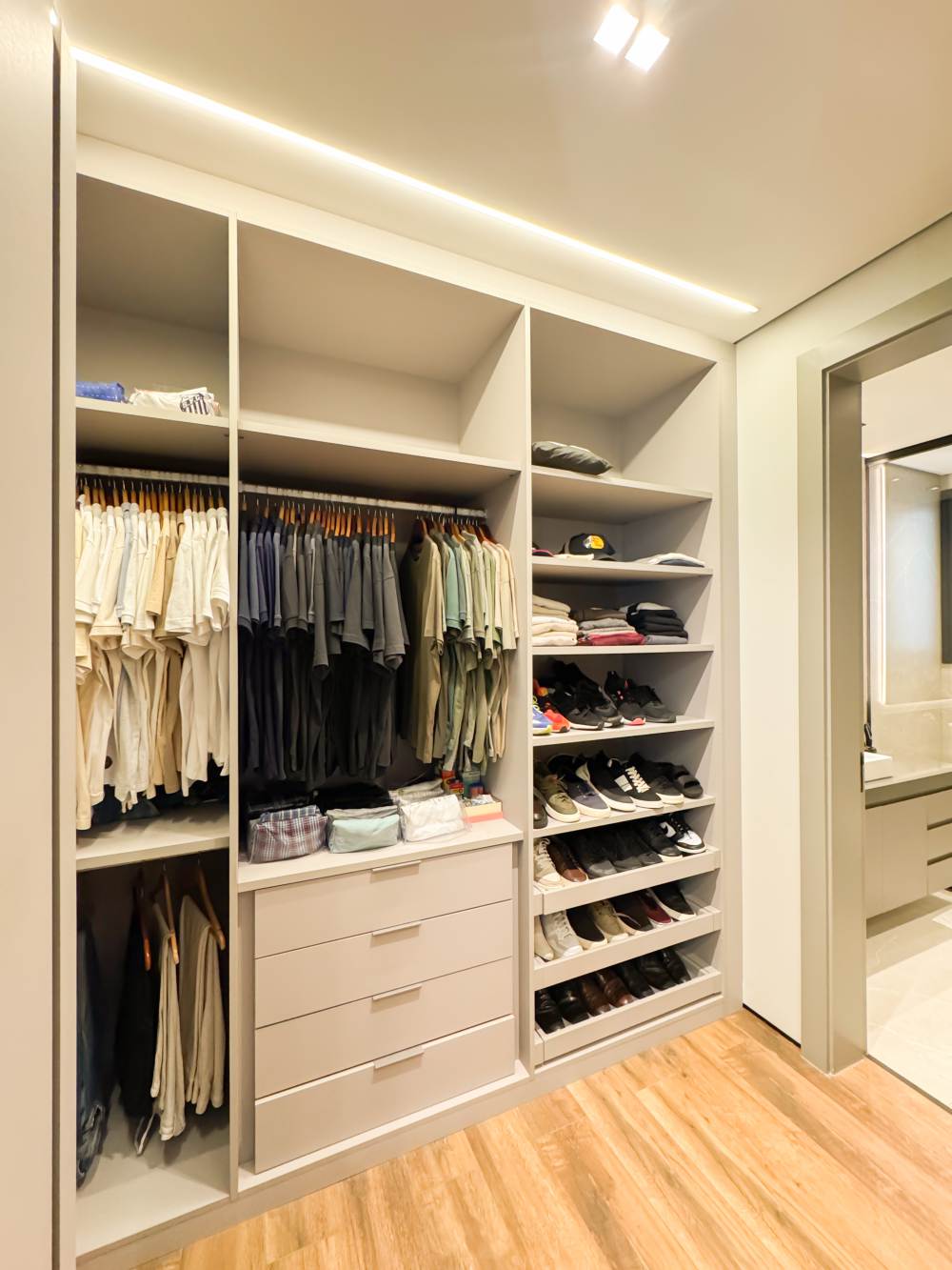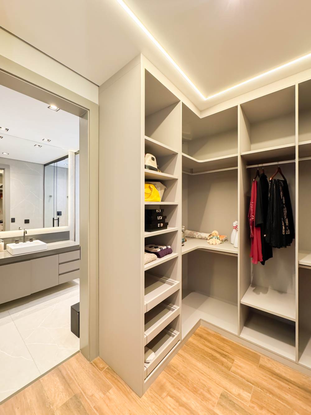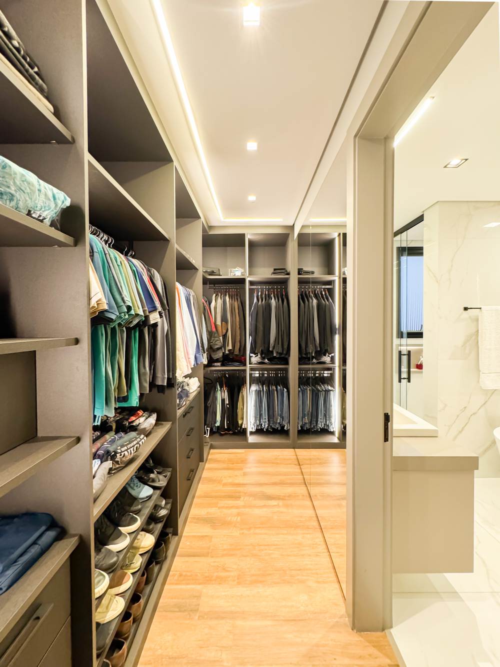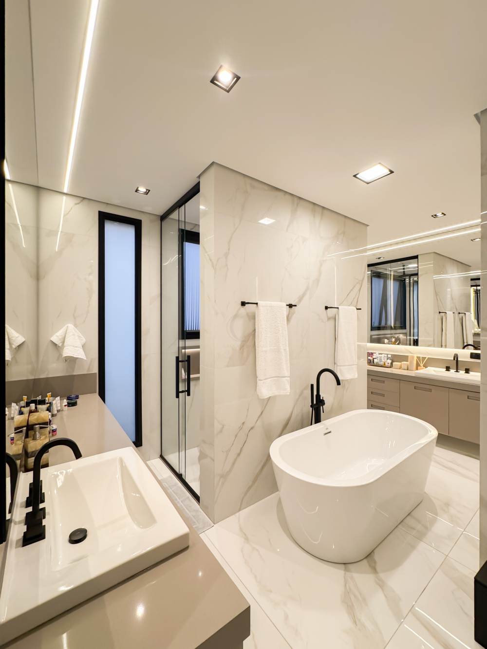 Suíte master com closets Sr. e Sra. e banheiro com divisão interna, banheira e revestimentos nobres