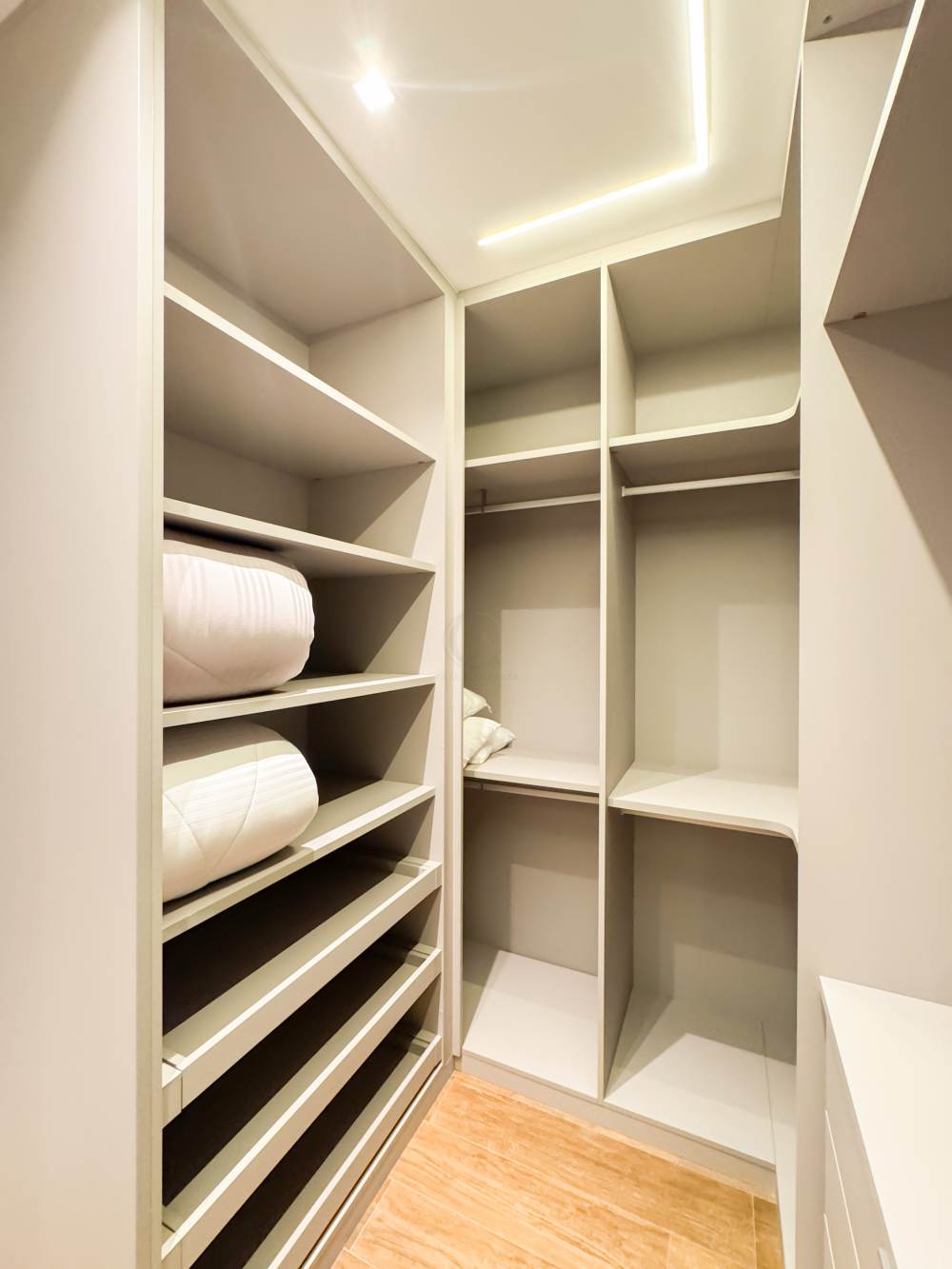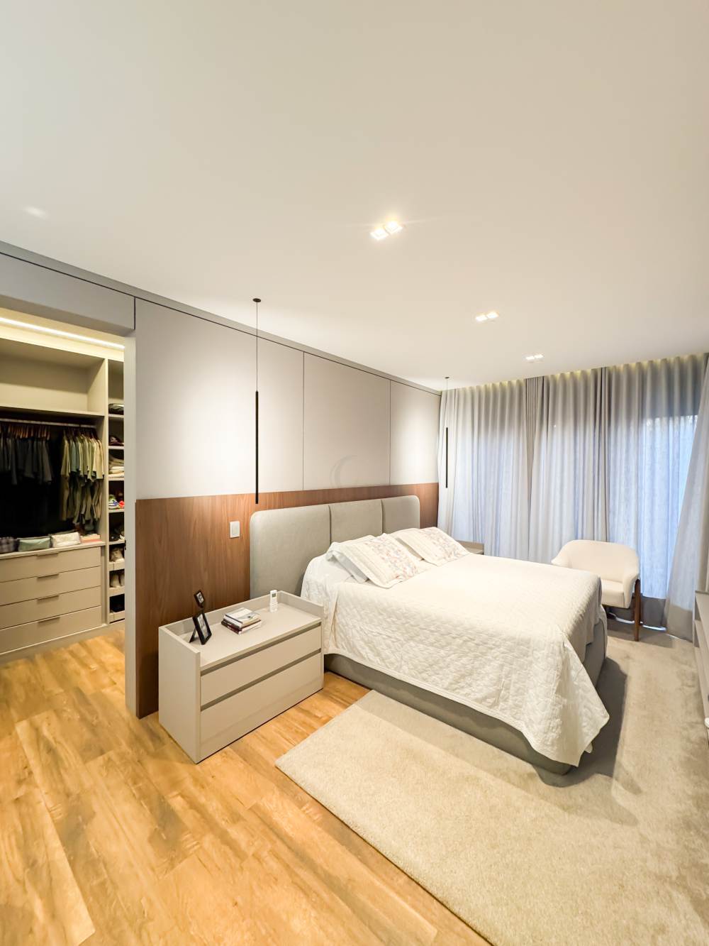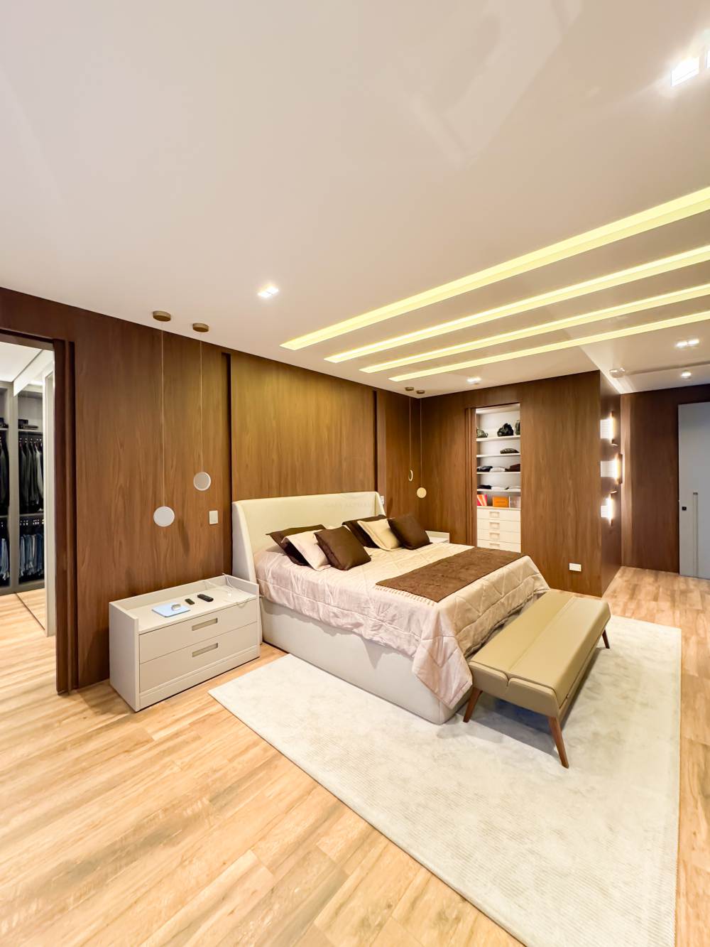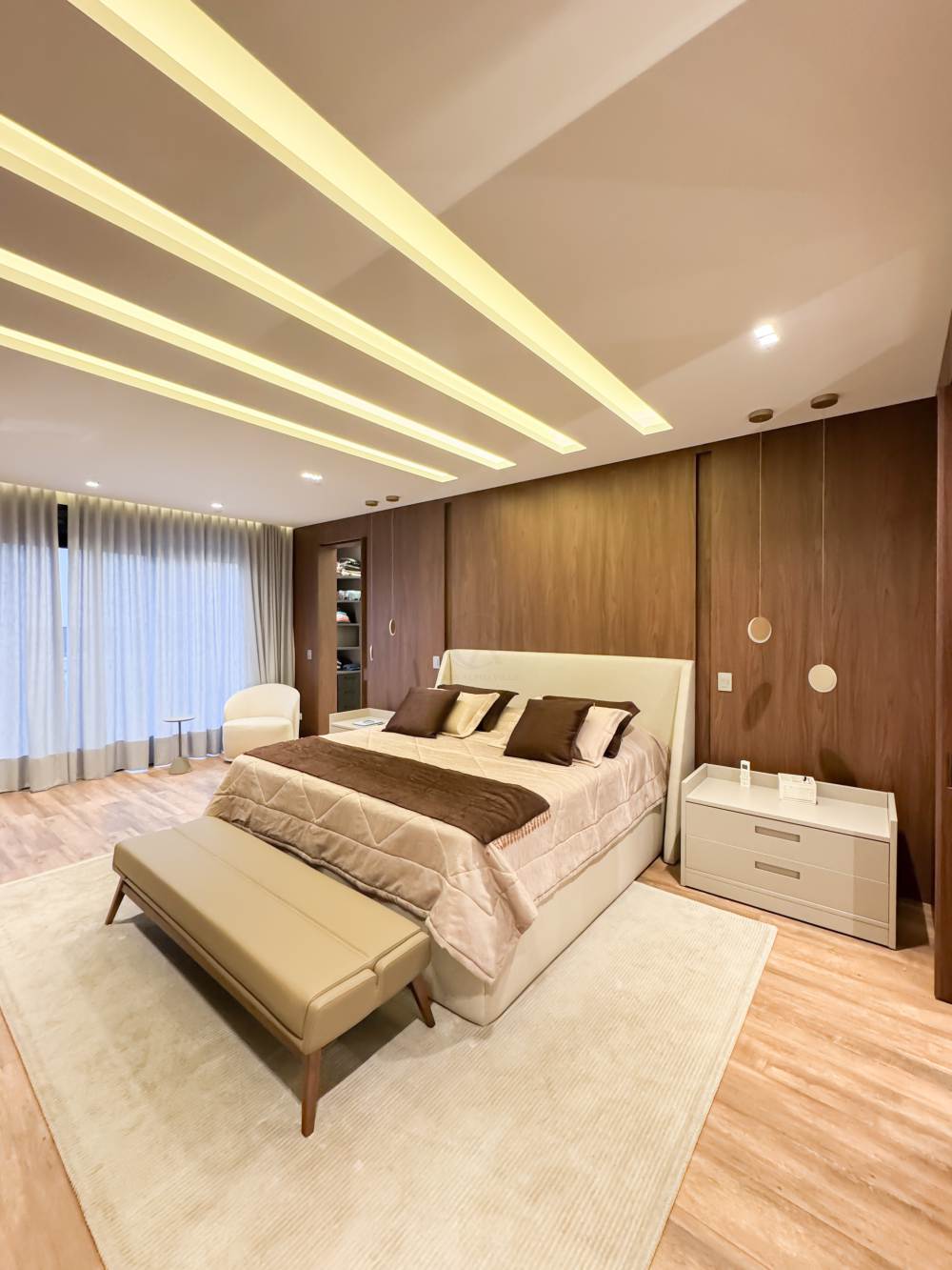 Suíte master com closets Sr. e Sra. e banheiro com divisão interna, banheira e revestimentos nobres